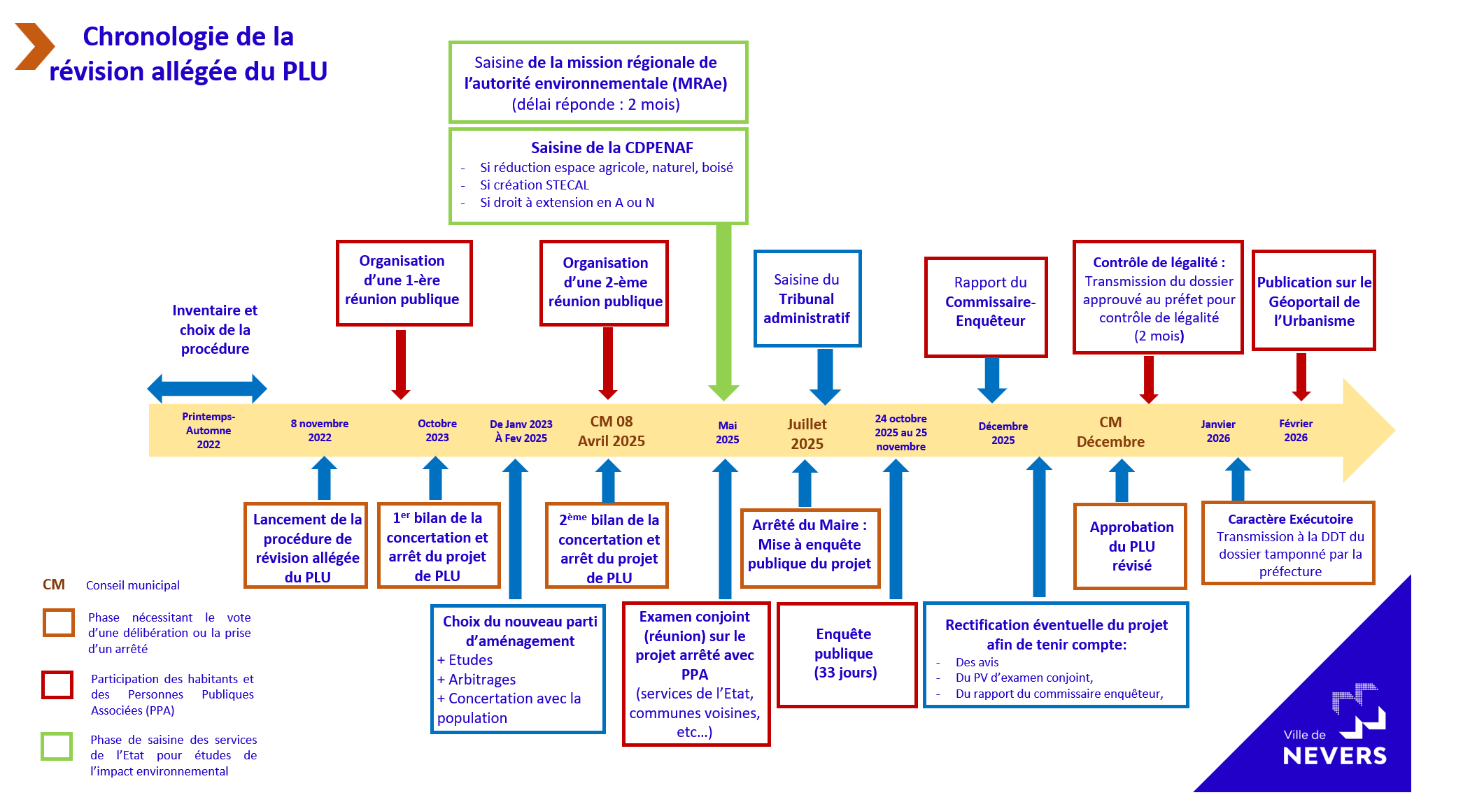 Depuis l’automne 2022, la Ville de Nevers a entamé la révision de son Plan local d’urbanisme (PLU). Le conseil municipal du 08 avril 2025 a tiré le bilan de concertation et a arrêté le projet de révision allégée du PLU mettant, ainsi, fin à la phase d’élaboration du contenu du document.